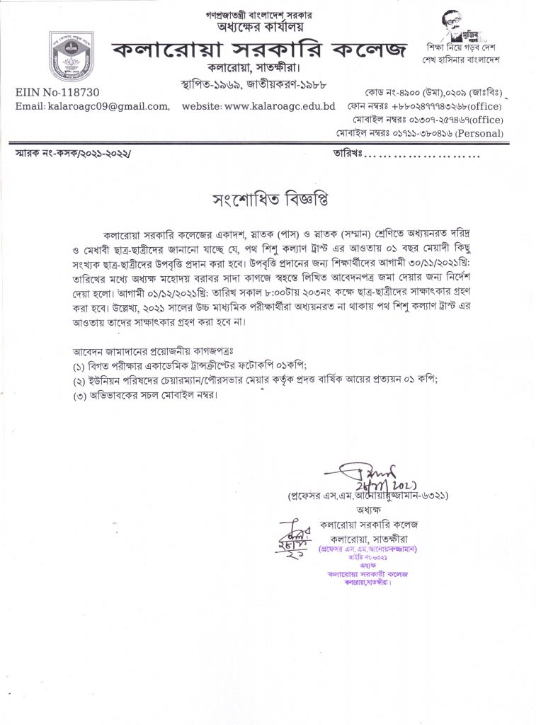 Post navigation ২০২০ সালের অনার্স ৪র্থ বর্ষ পরীক্ষার সময়সূচি প্রকাশ সংক্রান্ত বিজ্ঞপ্তি। ঈদ-ই মিলাদুন্নবী উদযাপন সংক্রান্ত বিজ্ঞপ্তি।