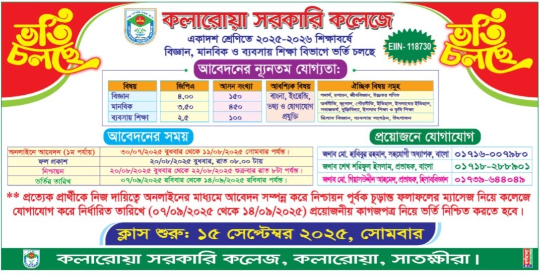 কলারোয়া সরকারি কলেজে ২০২৫-২০২৬ শিক্ষাবর্ষে একাদশ শ্রেণিতে ভর্তির অনলাইনে আবেদনের বিজ্ঞপ্তি। Post navigation কলারোয়া সরকারি কলেজে বাংলা নববর্ষ ১৪৩২ উদযাপন বুদ্ধ পূর্ণিমা (বৈশাখী পূর্ণিমা) উপলক্ষে কলেজ বন্ধ সংক্রান্ত বিজ্ঞপ্তি