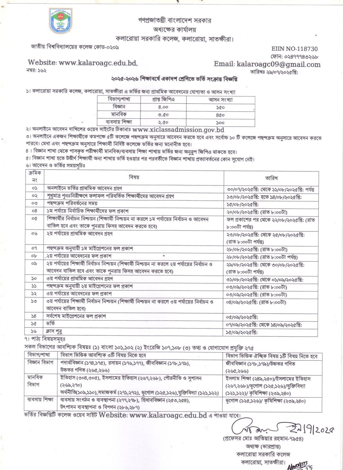 ২০২৫-২০২৬ শিক্ষাবর্ষে একাদশ শ্রেণিতে ভর্তির বিজ্ঞপ্তি
